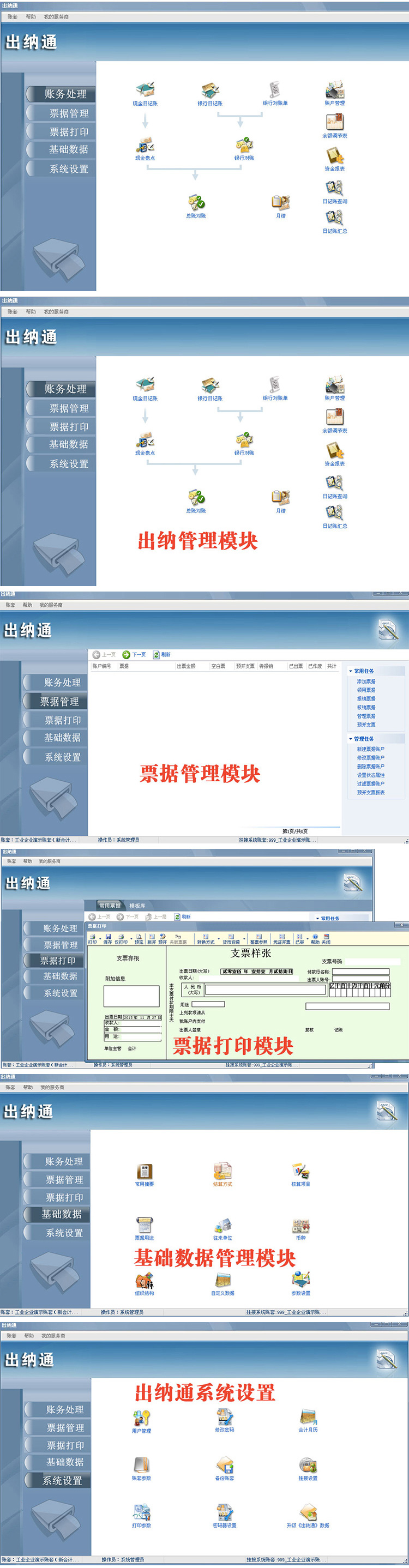 为出纳人员提供现金、银行业务日常处理、自动核对数据、形成银行余额调节表、日记账和其他其 它财务报表查询,同时支持支票管理簿方式,领用核销支票所产生数据可以自动生成日记账,帮助 企业全方位反映资金流变动情况。