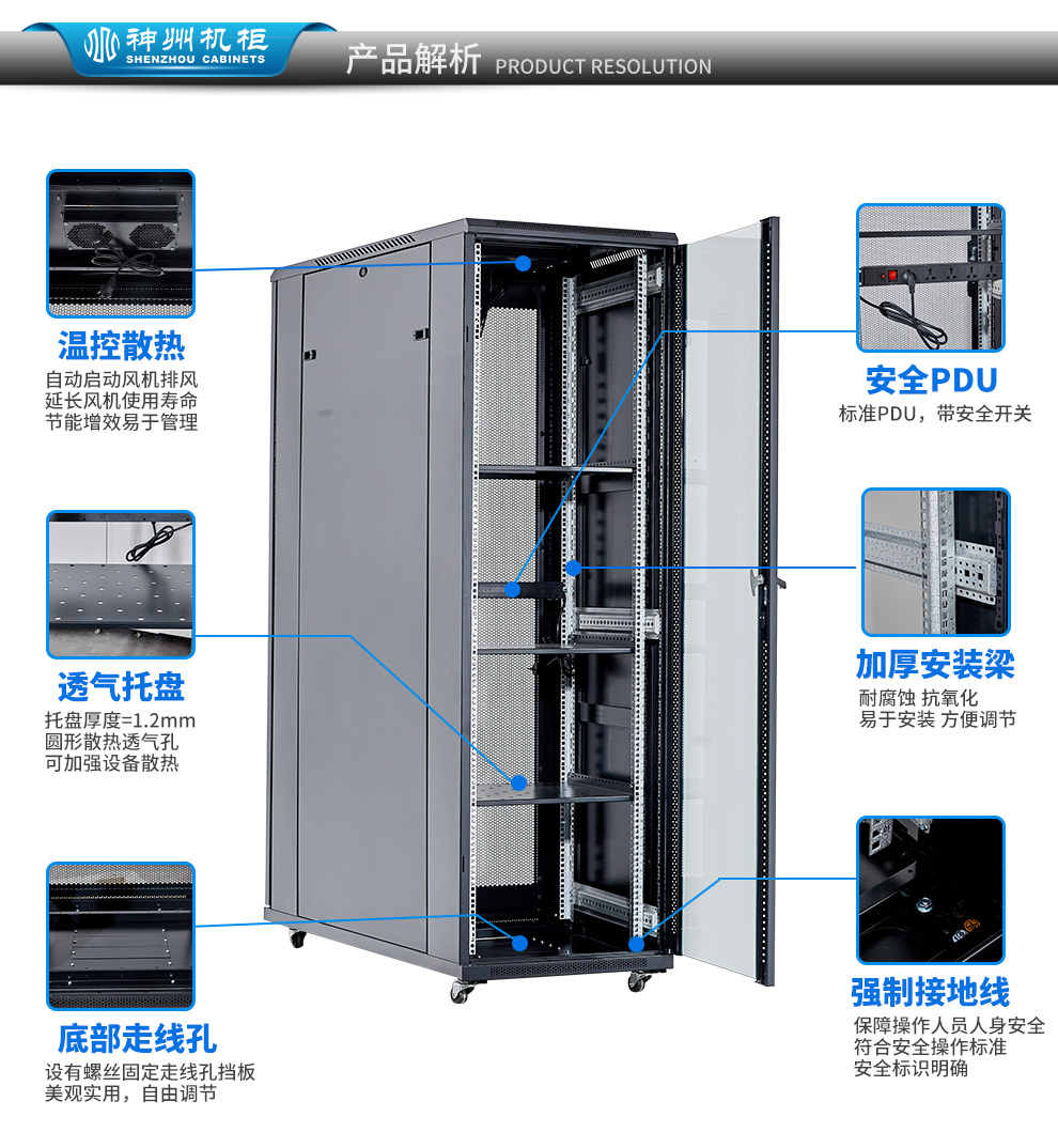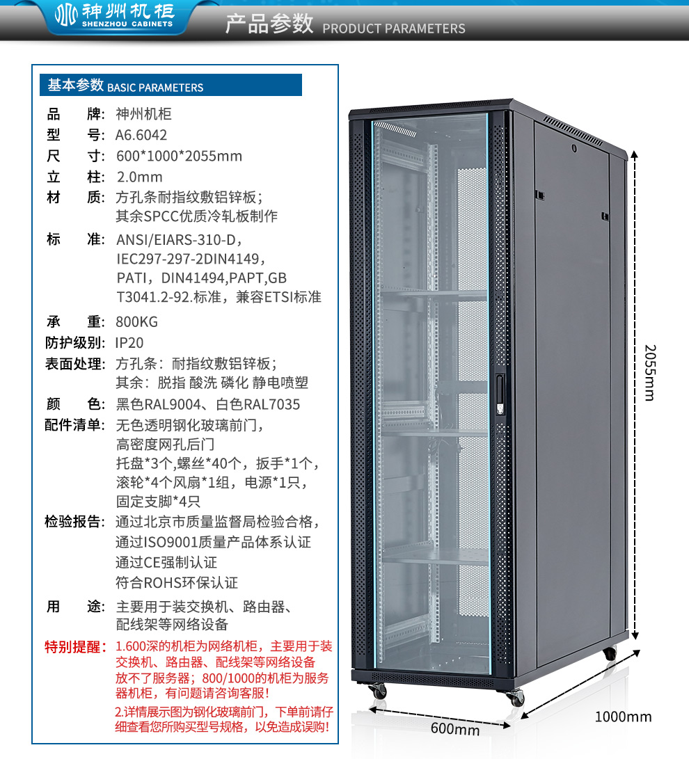 神州机柜 服务器机柜22U 1米深*600*1.2米高 钢化玻璃门 网络交换工控柜
