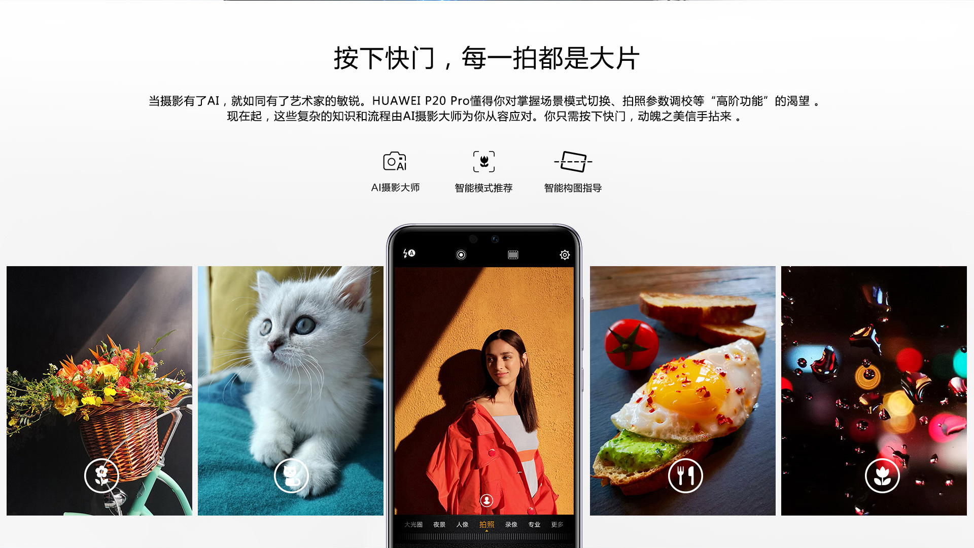 • 拍摄模式AI摄影大师、超级夜景、960fps 超级慢动作视频、3D 人像光效、3倍光学变焦(3倍变焦为近似值,实际等效焦距为27mm-80mm(80/27≈2.96倍))、5倍混合变焦(三个摄像头通过不同组合实现各种环境下出色的5倍变焦效果)、4D预测追焦、华为AI防抖、3D动态全景、大光圈、黑白相机、流光快门(含车水马龙、光绘涂鸦、丝绢流水、绚丽星轨)、专业模式、人像模式、魅我、美肤录像、全景、HDR、熄屏快拍、笑脸抓拍、声控拍照、定时拍照、触摸拍照、水印、文档校正、延时摄影、乐趣AR