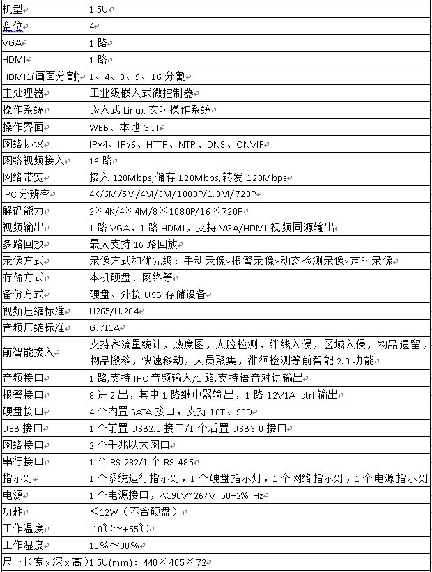 支持嵌入式Linux系统,工业级嵌入式微控制器 支持WEB、本地GUI界面操作 可接驳支持ONVIF、PSIA、RTSP协议的第三方摄像机和主流品牌摄像机 支持IPv4、IPv6、HTTP、NTP、DNS、ONVIF网络协议 支持最大16路网络视频接入,网络性能接入128Mbps,储存128Mbps,转发128Mbps 支持8M/6M/5M/4M/3M/1080P/1.3M/720P IPC分辨率接入 支持2×4K/4×4M/8×1080P/16×720P解码,最大支持16路视频回放 支持1路VGA,1路HDMI,支持VGA/HDMI视频同源输出 支持4个内置SATA接口,单盘容量支持10T,可配置成单盘,支持SSD 支持IPC音频1路输入,支持语音对讲1路输出,支持PC通过NVR与网络摄像机进行语音对讲 支持8路报警输入、2路报警输出,其中1路继电器输出,1路12V1A ctrl输出,支持开关量输入输出模式 支持2个USB接口(1个前置USB2.0接口、1个后置USB3.0接口) 支持2个千兆以太网口,支持2个不同段IP地址的IPC设备接入,支持将双网口设置同一个IP地址,实现数据链路冗余 支持按时间、按事件等多种方式进行录像的检索、回放、备份,支持图片本地回放与查询 支持标签自定义功能,设备支持对指定时间的录像进行标签并归档,便于后续査看 支持本机硬盘、网络等存储方式,支持硬盘、外接USB存储设备备份方式 支持设备操作日志、报警日志、系统日志的记录与查询功能 支持断网续传功能,能对前端摄像机断网这段时间内SD卡中的录像回传到NVR 支持即时回放功能,在预览画面下回放指定通道的录像 支持预览图像与回放图像的电子放大 采用大华协议,可以通过鼠标控制云台转动、放大、定位等操作 支持一键添加摄像机显示监控画面 支持远程管理IPC功能,支持对前端IPC远程升级,支持远程对IPC的编码配置修改等操作 支持远程零通道预览功能,可将接入的多路视频图像多画面显示在一路视频图像上 支持盘组管理功能,实现视频录像的定向存储 支持走廊模式功能,支持IPC画面旋转90°或270°,成9:16走廊模式 支持大华乐橙云功能