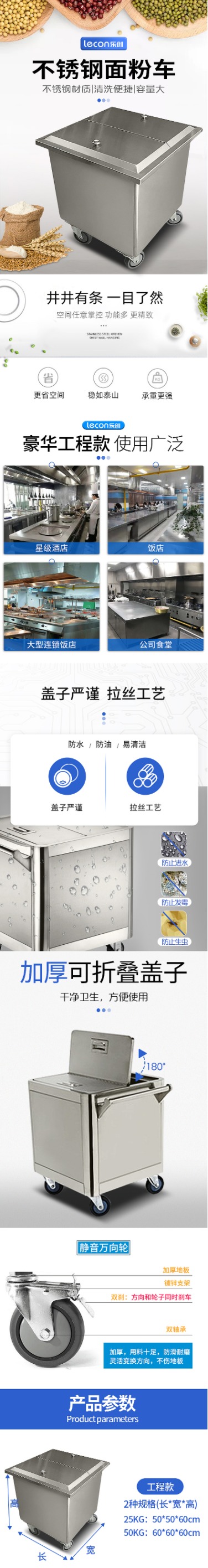 乐创(lecon)商用面粉车 25KG粮食干货面粉储备箱 LC-J-MFC02