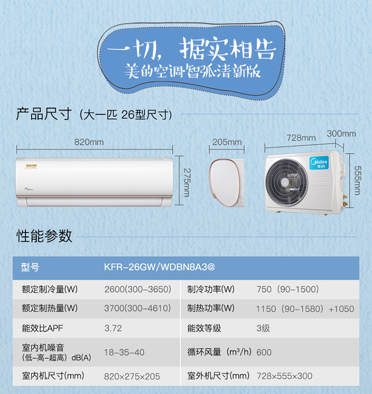 美的(Midea) 大1匹 变频 智弧 静音云智能 冷暖 挂机空调KFR-26GW/WDBN8A3